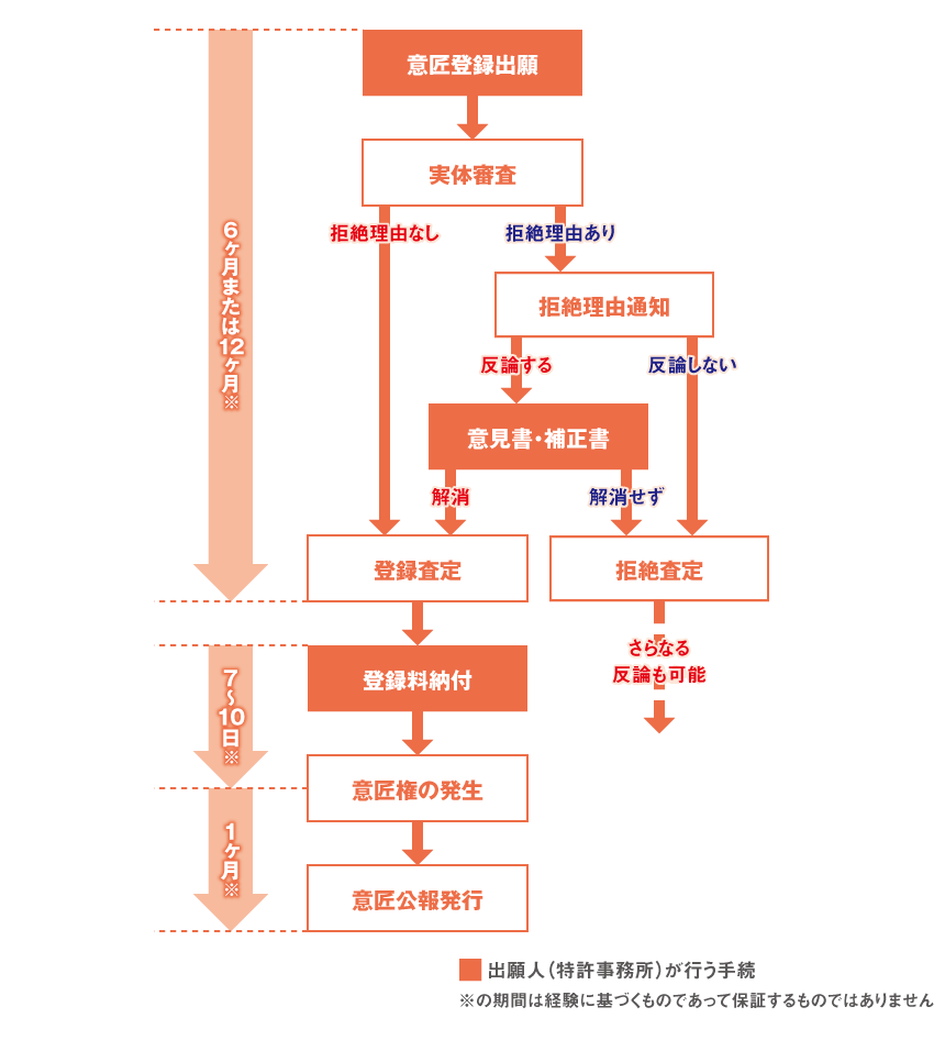 更に、シリーズ物として似ているデザインを考案した場合には、関連意匠として意匠権を取得することが可能です。特許権取得までの流れ(概略)
