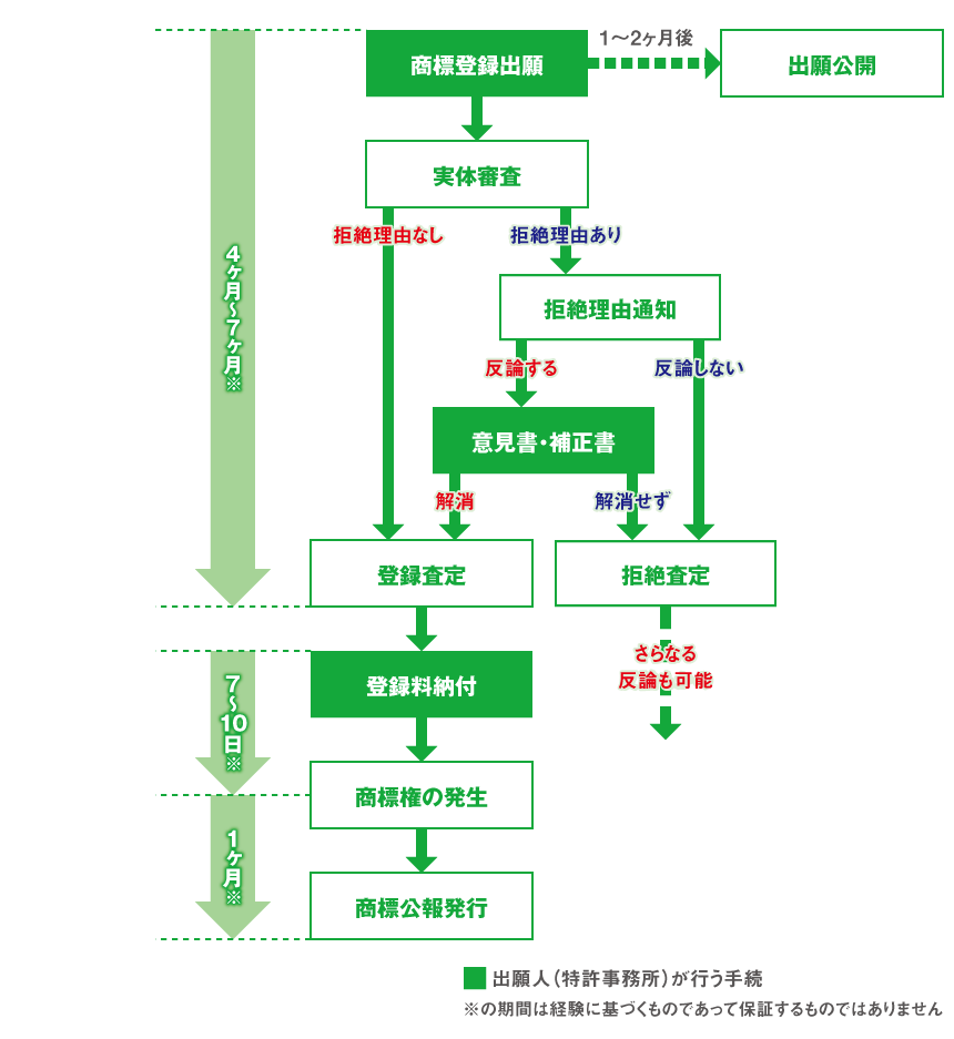 したがいまして、商売を行う以上は、自分の商品やサービスを守るために、また商標権侵害を起こすことなく安心して商標を使用するために、商標権を取得することをお勧めします。特許権取得までの流れ(概略)